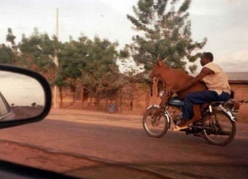 사진 속에는 소를 끌어안고 오토바이를 운전하고 있는 한 남성의 모습이 담겨 있다.