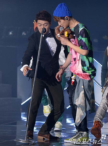 [엑스포츠뉴스 = 김성진 기자] 20일 오후 서울 송파구 방이동 올림픽공원 핸드볼경기장에서 열린 샤이니 컴백 쇼케이스(SHINee COMEBACK SHOW) ‘DREAM GIRL’에 전현무(왼쪽)가 샤이니의 마이크 댄스를 따라하다 마이크가 얼굴에 맞는 봉변을 당하고 있다.