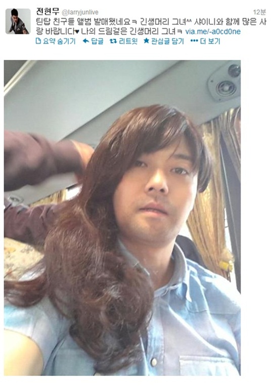 방송인 전현무는 25일 자신의 SNS 트위터에 "틴탑 친구들 앨범 발매됐네요. '긴 생머리 그녀', 샤이니와 함께 많은 사랑 바랍니다"라며 "나의 '드림걸'은 '긴 생머리 그녀'"라는 글과 함께 사진을 게재했다.