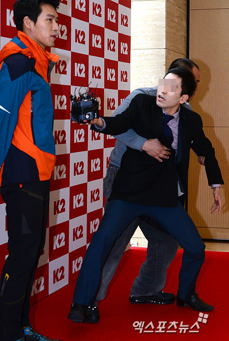 [엑스포츠뉴스 = 권태완 기자] 26일 오전 서울 양재동 엘타워에서 열린 아웃도어브랜드 'K2 S/S 패션쇼'에 참석한 현빈에게 한 연예정보프로그램 리포터가 인터뷰를 시도하다 제자당하고 있다.