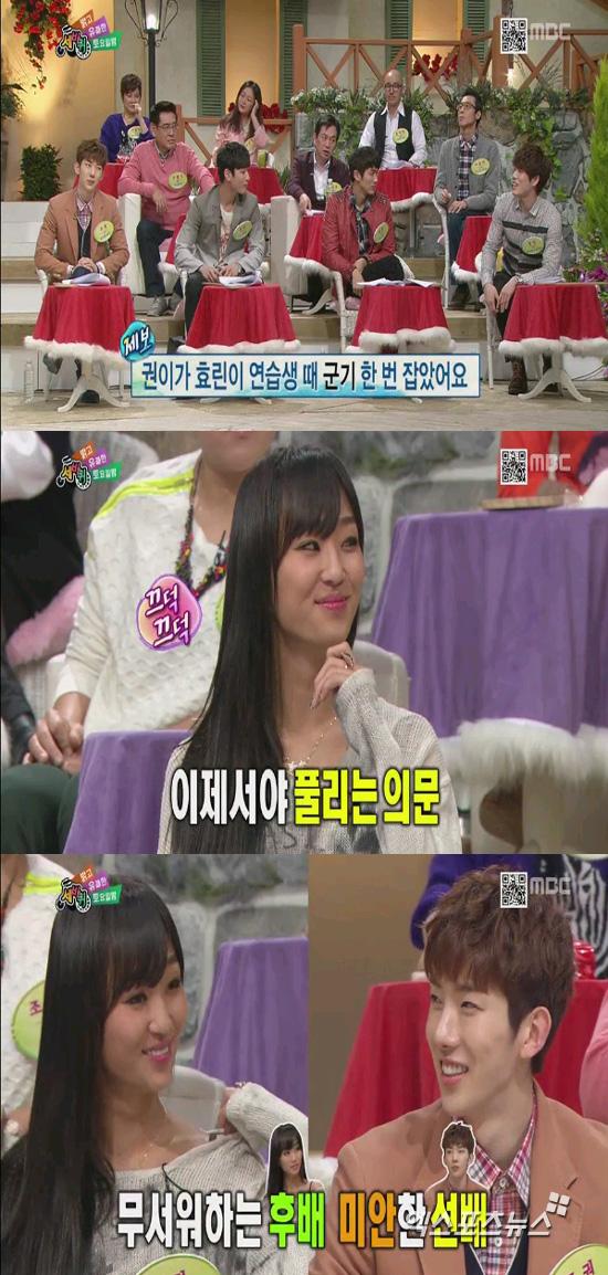 이에 같은 멤버 창민은 "권이가 효린이 연습생 때 군기를 한번 잡았어요"라며 제보했고 효린도 그 때의 일을 기억한다는 듯이 고개를 끄덕였다.