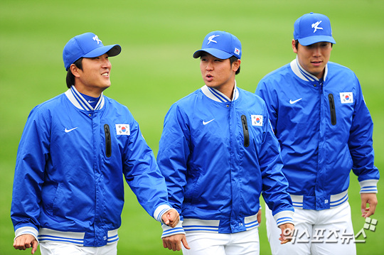 [엑스포츠뉴스=타이중(대만), 권혁재 기자] 3일 오후 대만 타이중야구장에서 열린 2013 월드베이스볼클래식(WBC 2013) 대한민국 대표팀 공식 훈련에서 이진영, 최정, 김현수가 훈련을 위해 이동하고 있다.