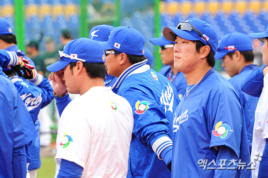 [엑스포츠뉴스=타이중(대만), 권혁재 기자] 4일 오후 대만 타이중 인터콘티넨탈구장에서 열린 2013 월드베이스볼클래식(WBC 2013) 1라운드 대한민국과 호주의 경기에 앞서 대한민국 선수들이 호주팀 타격 훈련을 바라보고 있다.