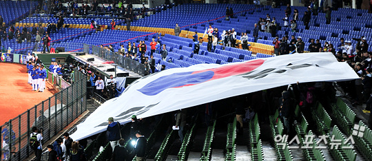 [엑스포츠뉴스=타이중(대만), 권혁재 기자] 4일 오후 대만 타이중 인터콘티넨탈구장에서 열린 2013 월드베이스볼클래식(WBC 2013) 1라운드 대한민국과 호주의 경기에 앞서 관중석에 대형 태극기가 펼쳐지며 국민의례를 하고 있다.