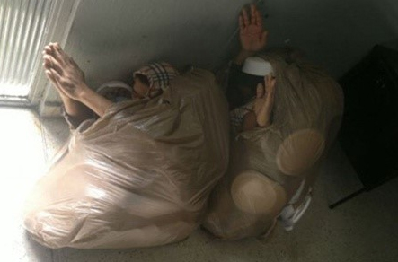 공개된 사진 속에는 두 명의 사람이 대형 비닐봉지 안에 들어가 손과 머리만을 조금 내놓고 있다.