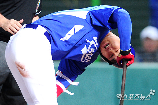 [엑스포츠뉴스=타이중(대만), 권혁재 기자] 4일 오후 대만 타이중 인터콘티넨탈구장에서 열린 2013 월드베이스볼클래식(WBC 2013) 1라운드 대한민국과 호주의 경기에서 3회초 1아웃 몸에 공을 맞은 최정이 고통스러워 하고 있다.