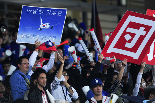 [엑스포츠뉴스=타이중(대만), 권혁재 기자] 5일 오후 대만 타이중 인터콘티내셔날야구장에서 열린 '2013 월드베이스볼클래식(WBC)' 1라운드 최종전 대한민국과 대만의 경기에서 대만 관중들이 '대한민국 안녕히가세요'라는 피켓을 들고 응원을 펼치고 있다.