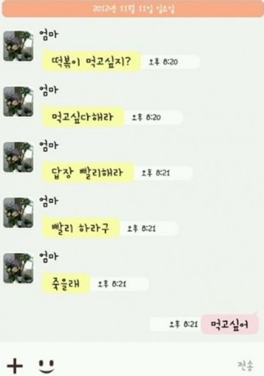 해당 사진은 엄마와 딸의 카카오톡 대화를 캡처한 것으로, 엄마는 딸에게 "떡볶이 먹고 싶지?" 라고 묻는다. 하지만 딸이 바로 답장을 하지 않자 엄마는 그새를 참지 못하고 딸에게 먹고 싶다고 하라며 답변을 재촉한다.