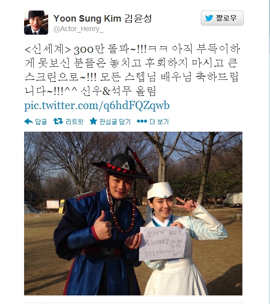 9일 김윤성은 자신의 트위터에 '"신세계' 300만 돌파. 아직 부득이하게 못보신 분들은 놓치고 후회하지 마시고 큰 스크린으로. 모든 스태프, 배우님 축하드립니다. 신우&석무 올림"라는 글과 함께 사진 한 장을 게재했다.