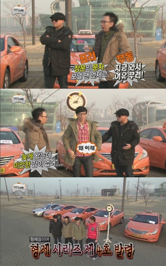 그러나 유재석은 3등으로 도착하며 지각을 하고 말았다. 박명수는 "문자를 보내 놓고 너는 늦냐"고 말했고, 유재석은 "형제 시리즈 4호가 발령됐다. 형제 시리즈가 발령되면 우리는 비상이다"고 말해 웃음을 자아냈다.