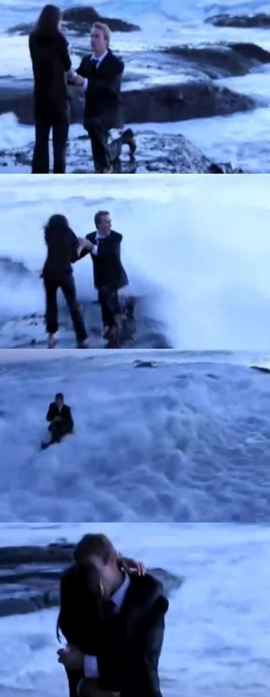 하지만 곧 두 사람은 거센 파도의 공격을 당했고, 정신을 차린 여성이 남자친구에게 대답 대신 진한 키스를 건네며 사랑을 표현했다.