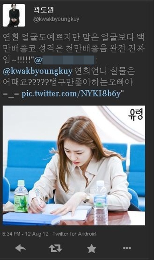 게재된 사진은 곽도원이 SNS 트위터를 통해 팬들과 나눈 대화의 캡처본이다. 한 팬이 곽도원에게 "연희언니 실물은 어때요? 소녀시대 태연만 좋아하는 오빠야"라고 묻자 곽도원은 "연희는 얼굴도 예쁘지만 마음은 얼굴보다 백만배 좋고 성격은 천만배 좋음. 완전 진짜임"이라고 답장했다.