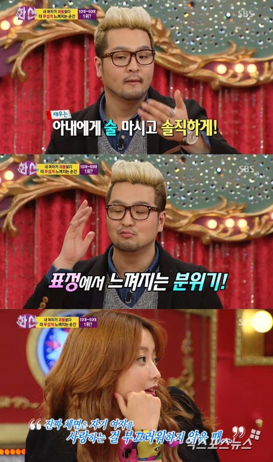 이날 김태우는 "나는 술을 마실 때는 솔직하게 술 마신다고 얘기한다"며 "그래서 결혼 전에 술 마시고 들어가는 것은 거짓말 하지 않겠다고 먼저 이야기를 했다"고 말했다.