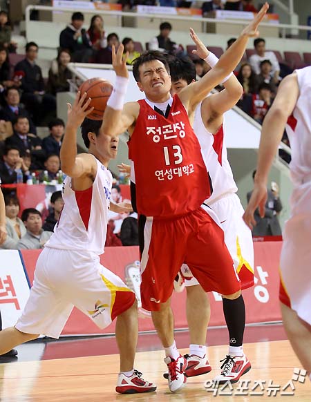 [엑스포츠뉴스 = 안양, 김성진 기자] 22일 오후 경기 안양시 동안구 비산동 안양실내체육관에서 열린 ‘2012-2013 KB국민카드 프로농구’ 6강 플레이오프 1차전 안양 KGC인삼공사와 고양 오리온스의 경기에 김성철(가운데)이 돌파를 시도하다 반칙을 당하고 있다.