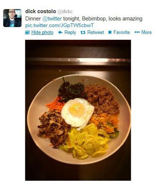 21일(현지시간) 코스톨로 CEO는 자신의 트위터에 "오늘밤 회사에서 먹은 저녁식사, 비빔밥, 맛있어 보인다(Dinner @twitter tonight, Bebimbop, looks amazing)"는 글과 함께 한국의 대표음식인 비빔밥 사진을 올렸다.