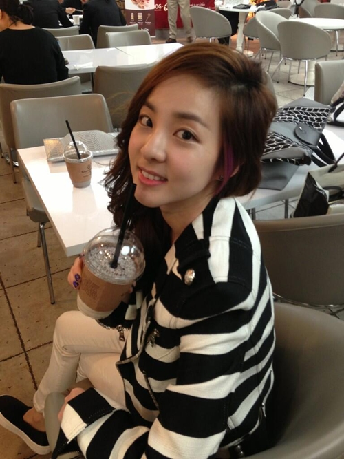 공개된 사진 속 산다라박은 커피를 들고 카메라를 응시하고 있다. 특히 특유의 동안 외모와 함께 자주색으로 염색한 구레나룻이 눈길을 끌고 있다.