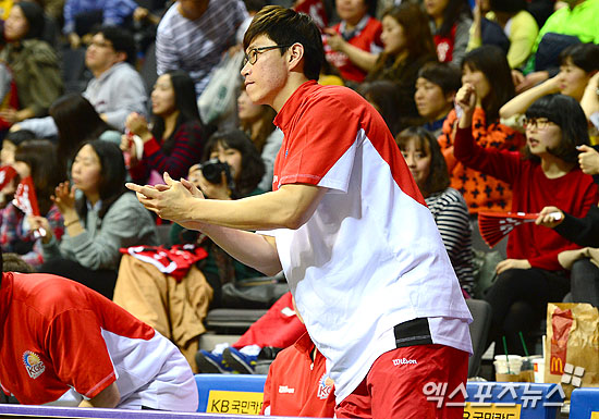 [엑스포츠뉴스 = 권태완 기자] 26일 오후 경기도 고양실내체육관에서 열린 '2012-2013 KBL 프로농구' 6강 플레이오프 3차전 고양 오리온스와 안양 KGC의 경기에 오세근이 벤치에서 응원을 하고 있다.