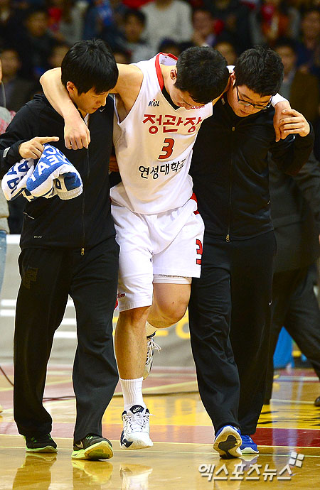 [엑스포츠뉴스 = 권태완 기자] 26일 오후 경기도 고양실내체육관에서 열린 '2012-2013 KBL 프로농구' 6강 플레이오프 3차전 고양 오리온스와 안양 KGC의 경기에 이정현이 4쿼터에 부상으로 부축받아 나오고 있다.