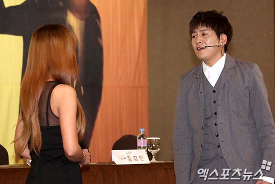 [엑스포츠뉴스 = 김성진 기자] 27일 오후 서울 중구 소공동 롯데호텔에서 열린 뮤지컬 ‘남자가 사랑할 때’ 제작발표회에 홍경민(오른쪽)이 나르샤를 바라보며 열창하고 있다.