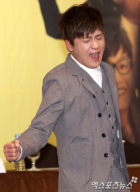 [엑스포츠뉴스 = 김성진 기자] 27일 오후 서울 중구 소공동 롯데호텔에서 열린 뮤지컬 ‘남자가 사랑할 때’ 제작발표회에 홍경민이 열창하고 있다.