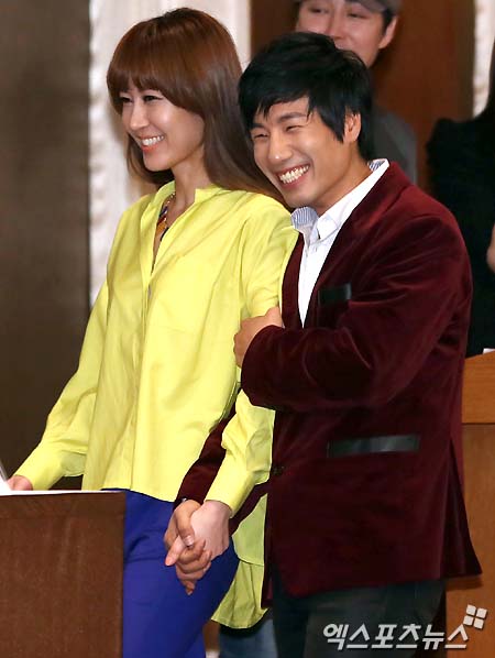 [엑스포츠뉴스 = 김성진 기자] 27일 오후 서울 중구 소공동 롯데호텔에서 열린 뮤지컬 ‘남자가 사랑할 때’ 제작발표회에 김재만(오른쪽)이 정영주의 손을 잡고 입장하고 있다.