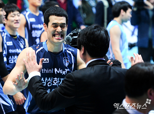 삼성화재 고희진이 신치용 감독과 포옹하기 위해 다가가고 있다.