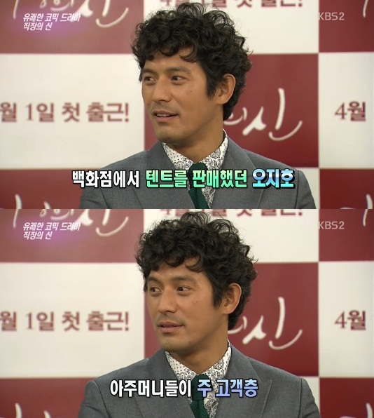 이날 리포터는 "연기 의외에 다른 직업을 가져본 적이 있느냐"고 묻자, 오지호는 "데뷔하기 전에 백화점에서 지나가는 아주머니들에게 텐트를 팔았다"고 대답했다.