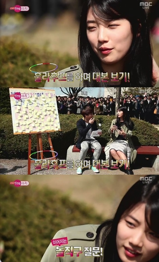 이날 리포터는 "숙소에서 주로 뭘 하냐"라고 물었고, 수지는 "훌라후프를 하면서 대본을 본다"라고 남다른 몸매 비결을 전했다.