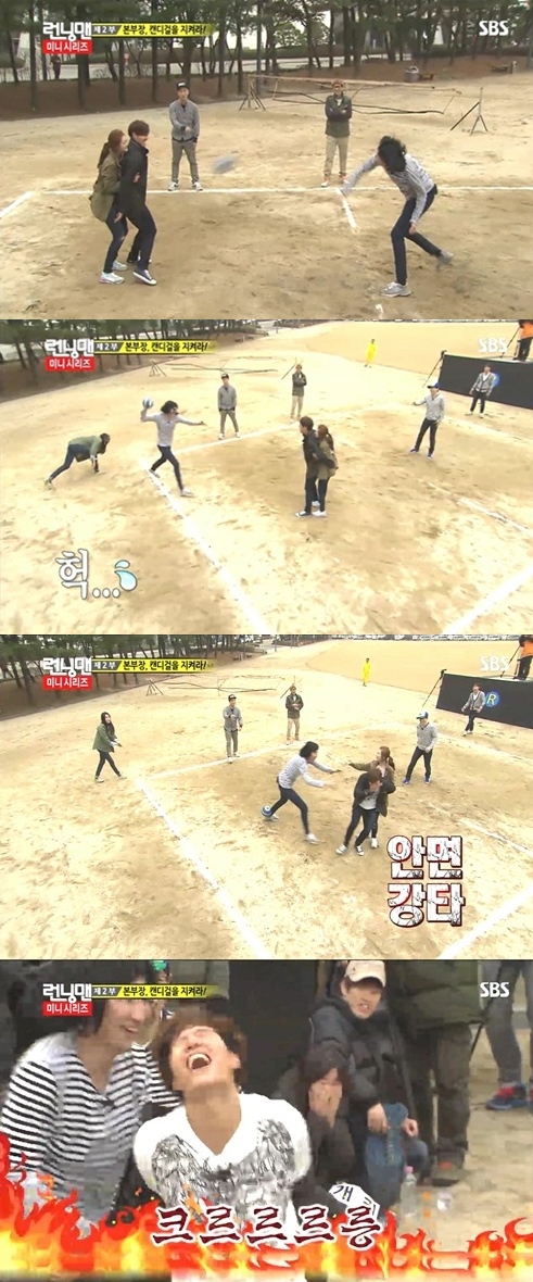 이날 이광수는 공이 손에 들어오자마자 김종국을 향해 힘껏 공을 던졌다.