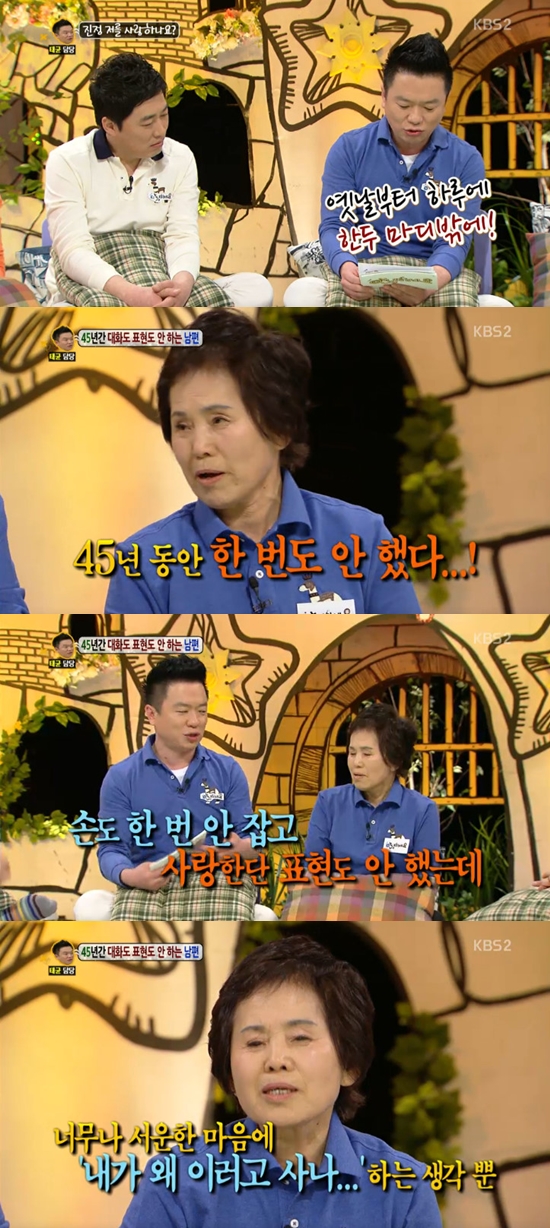 1일 오후 방송된 KBS 2TV '안녕하세요'에 출연한 사연의 주인공은 "남편은 45년동안 살면서 '사랑해'라는 말을 듣지 못했다. 하루에 한 두마디 정도 밖에 하지 않는다"라고 고민을 토로했다.