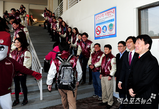 경기전 넥센 이장석 대표와 구단 직원들이 입장하는 관중들에게 인사하고 있다.