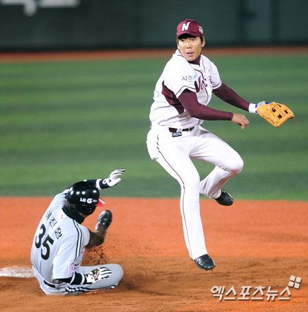 [엑스포츠뉴스=권혁재 기자] 2일 오후 목동야구장에서 열린 '2013 한국야쿠르트 세븐 프로야구' 넥센 히어로즈의 홈 개막전 LG 트윈스와의 경기에서 넥센이 3-0으로 앞선 6회초 1아웃 1루 넥센 강정호가 LG 정의윤의 내야땅볼때 1루주자 이진영을 2루에서 포스아웃 시키고 1루로 송구하고 있다.