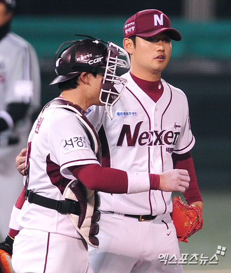 승리를 지켜낸 넥센 마무리 투수 손승락과 포수 박동원이 하이파이브를 나누고 대화하고 있다.
