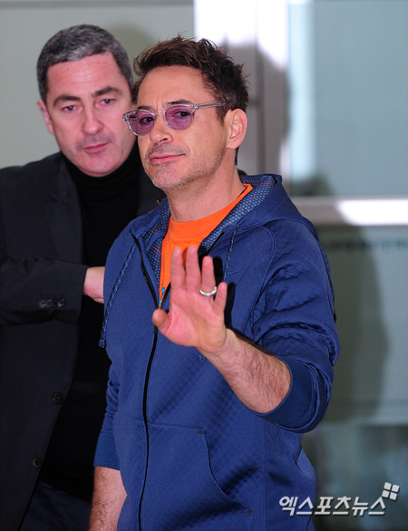 로버트 다우니 주니어가 입국장을 나서며 팬들에게 손을 흔들고 있다.