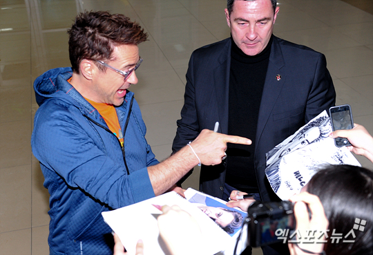 로버트 다우니 주니어가 입국장을 나서며 팬들에게 사인을 해주고 있다.