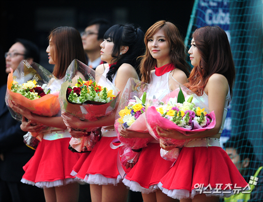 [엑스포츠뉴스=권혁재 기자] 5일 오후 잠실야구장에서 열린 '2013 한국야쿠르트 세븐 프로야구' LG 트윈스와 두산 베어스의 경기 홈 개막 행사에 LG 치어리더들이 꽃다발을 들고 행사를 진행하고 있다.