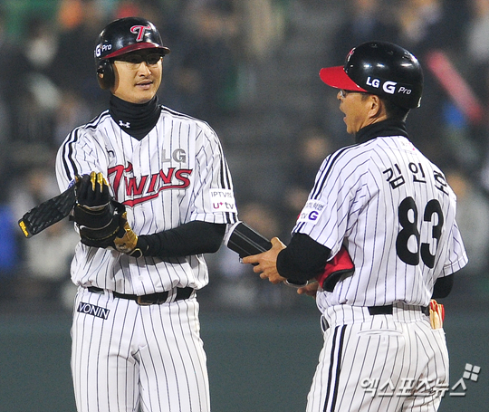 [엑스포츠뉴스=권혁재 기자] 5일 오후 잠실야구장에서 열린 '2013 한국야쿠르트 세븐 프로야구' LG 트윈스와 두산 베어스의 경기에서 LG가 4-3으로 앞선 4회말 2아웃 2루 LG 박용택이 중견수 앞 1타점 적시타를 날리고 1루에서 김인호 코치와 대화를 나누고 있다.