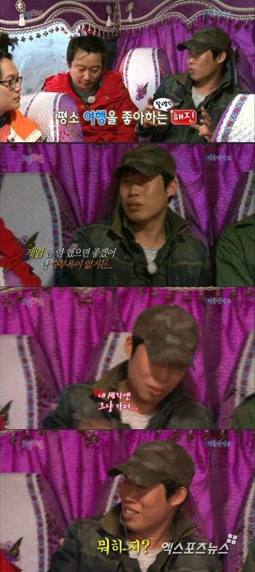 유해진은 첫만남으로 살짝 어색한 분위기 속에서 "평소에 여행을 좋아한다. 그래서 '1박 2일'이 좋았다"면서 "그런데 게임은 좀 안 했으면 좋겠다. 내가 승부욕이 없다"고 말했다.