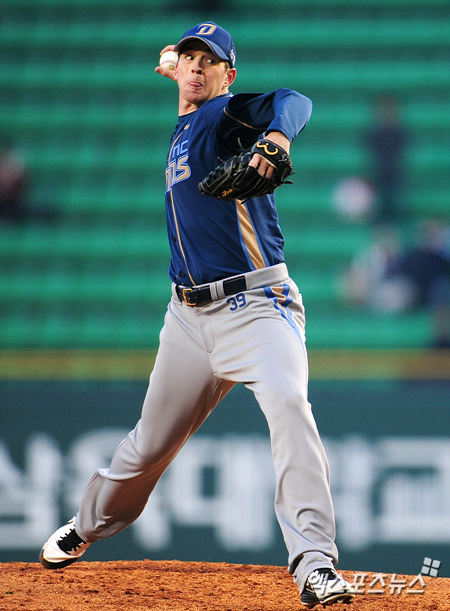 [엑스포츠뉴스=잠실, 권혁재 기자] 9일 오후 잠실야구장에서 열린 '2013 한국야쿠르트 세븐 프로야구' LG 트윈스와 NC 다이노스의 경기에서 NC 선발투수 찰리가 힘차게 공을 던지고 있다.