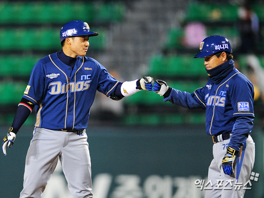 [엑스포츠뉴스=잠실, 권혁재 기자] 9일 오후 잠실야구장에서 열린 '2013 한국야쿠르트 세븐 프로야구' LG 트윈스와 NC 다이노스의 경기에서 6회초 무사 1, 3루 NC 김태군이 좌익수 앞 1타점 적시타를 날리고 1루에서 전주호 코치와 하이파이브 하고 있다.