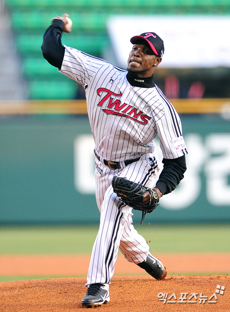 [엑스포츠뉴스=잠실, 권혁재 기자] 10일 오후 잠실야구장에서 열린 '2013 한국야쿠르트 세븐 프로야구' LG 트윈스와 NC 다이노스의 경기에서 LG 선발투수 리즈가 힘차게 공을 던지고 있다.