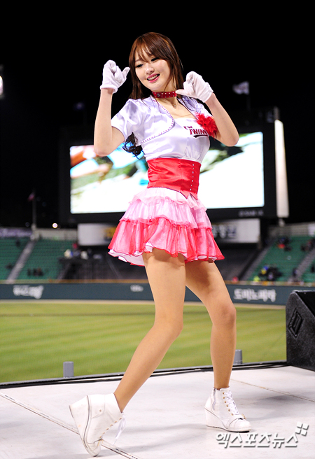 [엑스포츠뉴스=잠실, 권혁재 기자] 10일 오후 잠실야구장에서 열린 '2013 한국야쿠르트 세븐 프로야구' LG 트윈스와 NC 다이노스의 경기에서 LG 치어리더 김민지가 섹시한 안무를 펼치고 있다.