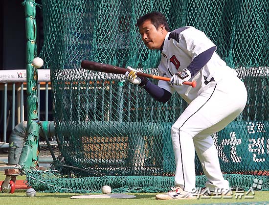 김동주 '두목곰도 피해갈 수 없는 번트연습'[포토]
