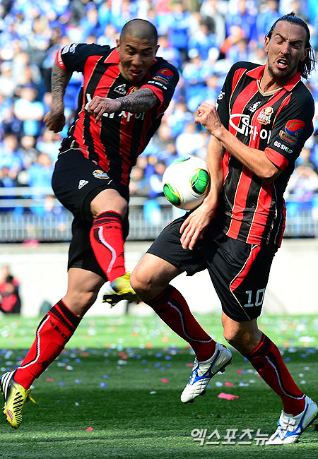 [엑스포츠뉴스 = 수원 권태완 기자] 14일 오후 경기도 수원월드컵경기장에서 열린 '2013 K-리그' FC서울과 수원 삼성의 경기에 차두리의 슛팅이 데얀에 맞고 있다.