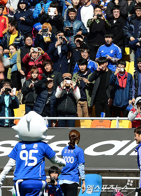 [엑스포츠뉴스 = 수원 권태완 기자] 14일 오후 경기도 수원월드컵경기장에서 열린 '2013 K-리그' FC서울과 수원 삼성의 경기에 김연아가 팬들에게 인사를 하고 있다.