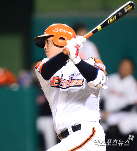 [엑스포츠뉴스=대전, 권혁재 기자] 16일 오후 대전한밭야구장에서 열린 '2013 한국야쿠르트 세븐 프로야구' 한화 이글스와 NC 다이노스의 경기에서 한화가 6-4로 앞선 7회말 1아웃 한화 최진행이 중전안타를 날리고 있다.