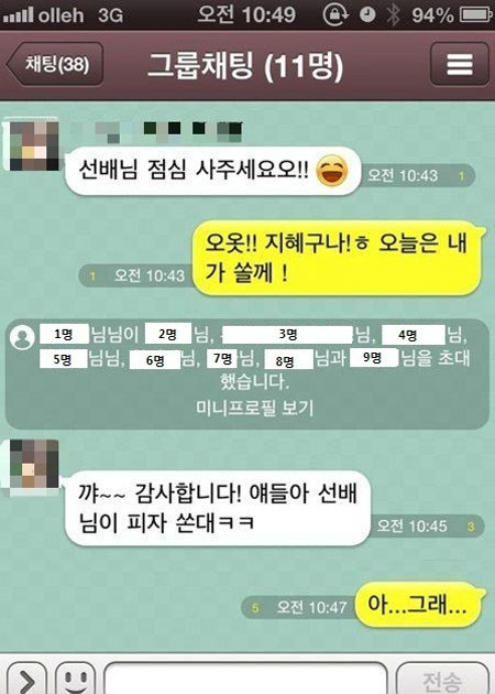 이에 남자 선배는 여자 후배를 반가워하며 본인이 사겠다고 답했고, 이때 여자 후배는 친구들 9명을 채팅방으로 초대했다.