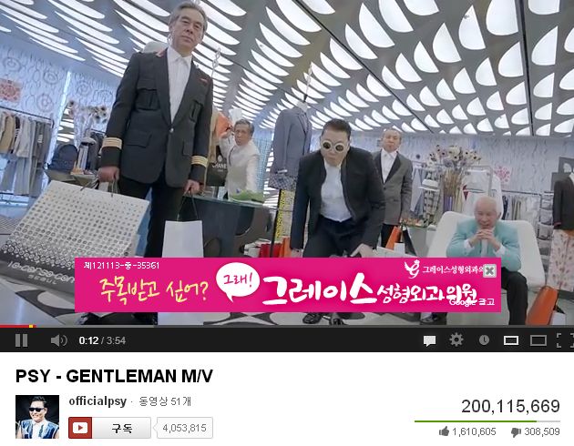 전작 '강남스타일'은 유튜브 조회 수 2억뷰를 넘어서기까지 66일이 걸렸다. 이번 '젠틀맨'은 이 기록을 57일이나 단축한 셈이다.