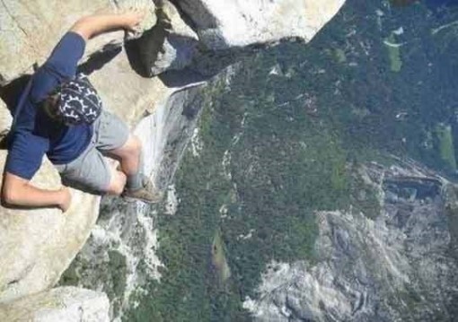 공개된 사진에는 한 남성이 산꼭대기에 있는 바위에 걸터 앉은 채 발 아래를 내려다 보고 있다. 남성의 발 아래에는 아득한 낭떠러지가 펼쳐져 있다.
