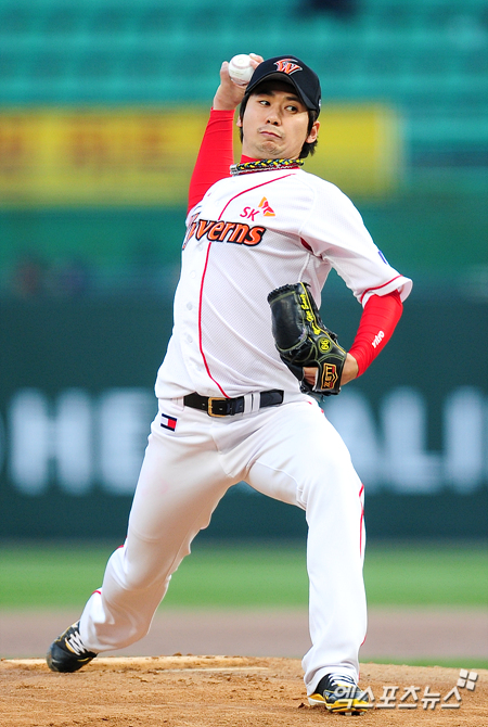 [엑스포츠뉴스=문학, 권혁재 기자] 26일 오후 인천 문학야구장에서 열린 '2013 한국야쿠르트 세브 프로야구' SK 와이번스와 한화 이글스의 경기에서 SK 선발투수 윤희상이 힘차게 공을 던지고 있다.
